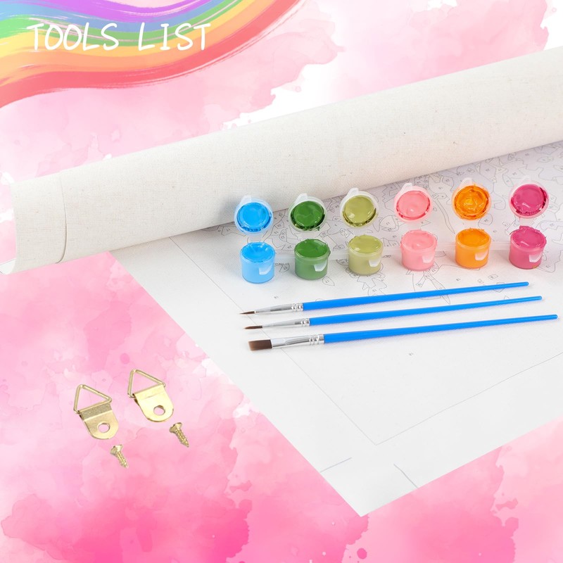 - What You Will Get: 1 pre-printed canvas, 1 set of acrylic paints, 2 hanging hooks, 2 screws and 3 paintbrushes, 1 color postcard guide