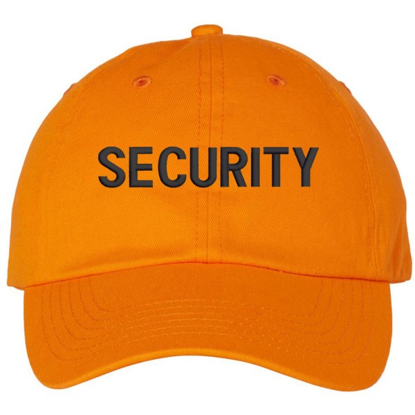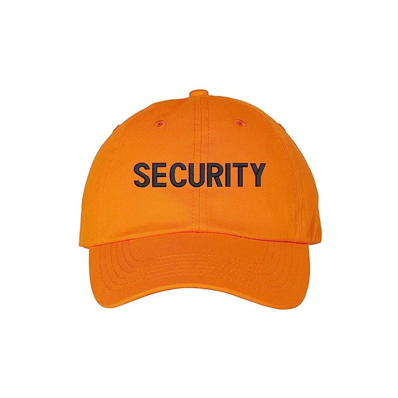 - SECURITY DAD HAT is an embroidered low profile hat with "SECURITY" text prominently featured on the front. The SECURITY text is thin and measures 4 inches wide by 0.75 inches high, making it easy to read from a distance.