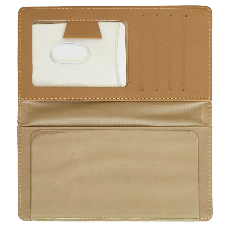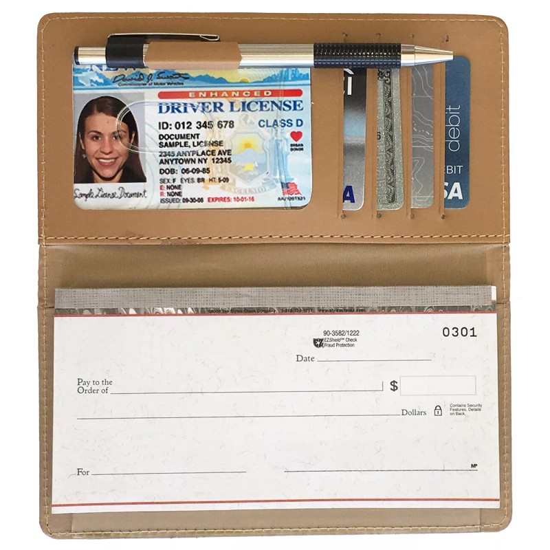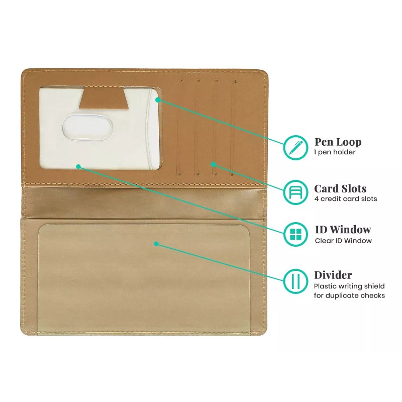 • FEATURES - The checkbook cover contains 4 credit card slots, 1 clear ID window slot, 1 pen loop, a plastic check divider for duplicate checks and 1 interior slip pocket to hold a checkbook register