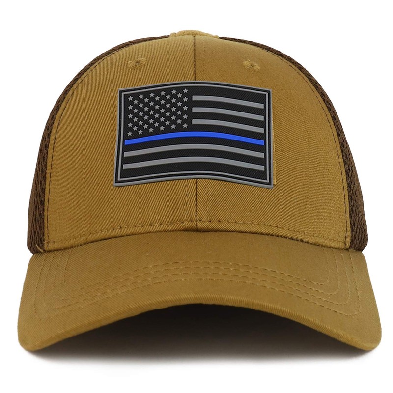 Armycrew Thin Blue Line American Flag 3D Rubber Tactical Patch Air Mesh Flex Cap - Coyote - L-XL