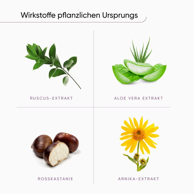 - ➡️ 500 ml gel formula for tired legs: an extract of aloe vera that is characterised by its content of amino acids. Extract of horse chestnut, extract of ruscus, extract of witch hazel and extract of arnica, which are characterised by their diuretic effect and their vein therapeutic activity.