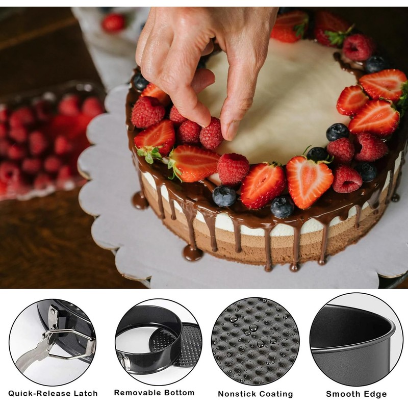 - REMOVEABLE BOTTOM DESIGN - This springform pan kit has removable bottom and buckle design, quick-release latch, which allows you to demold the cake from the pan with beautiful shape and edges