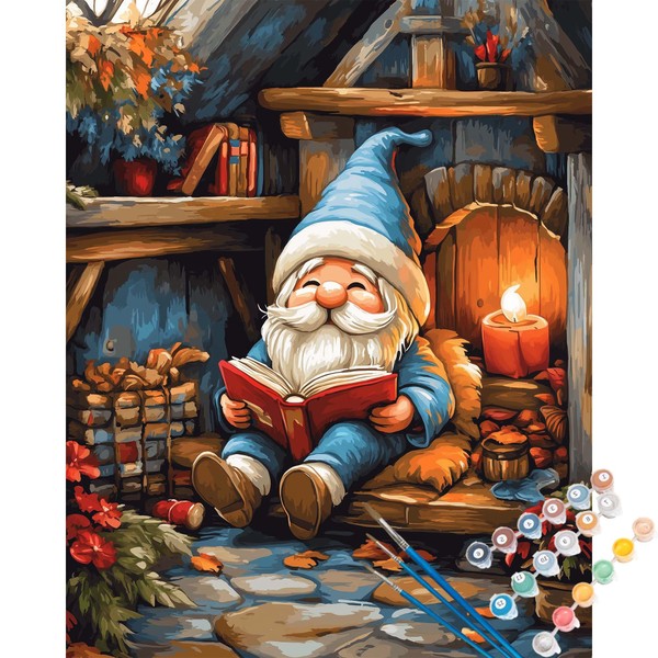 ARNLRDYA Gnome Reading Books Paint by Numbers Kits, Gnomes Paint by Number for Adults, Gnome in Wooden House Acrylic Painting for Gift Home Study Decor(16×20inches, Unframe)