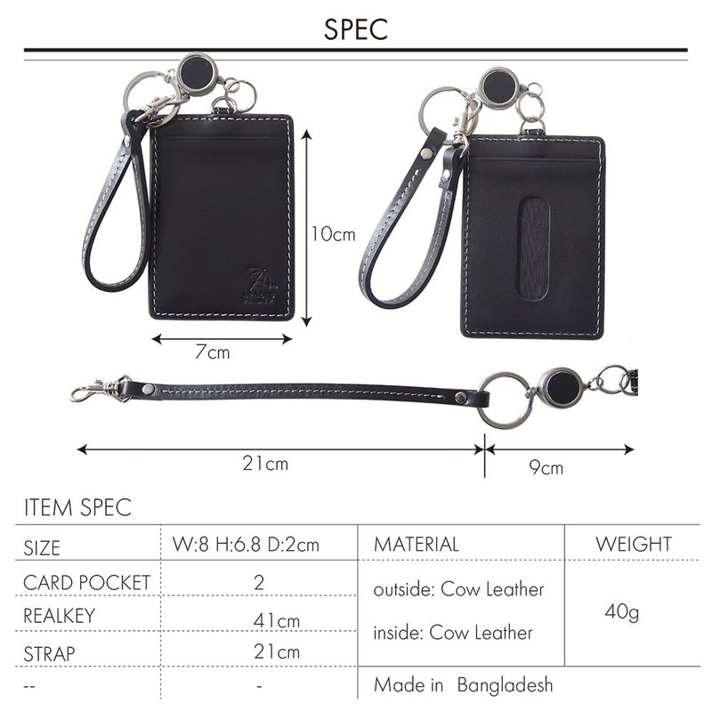 - Material: Cowhide leather; Size: Pass case: Width 3.9 x Height 2.8 x Thickness 0.2 inches (10 x 7 x 0.5 cm); Strap: Length 3.9 inches (10 cm); Reel key: Extends to 23.6 inches (60 cm). Specifications: Card pocket x 1, finger hole card pocket x 1