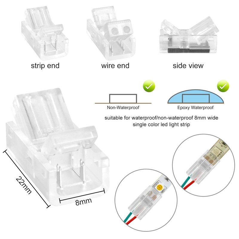 - Application These connectors are suitable for connecting 8mm wide waterproof and non-waterproof 3528/2835 LED strips. Rated Voltage: 0-36V; Rated Current: 5A