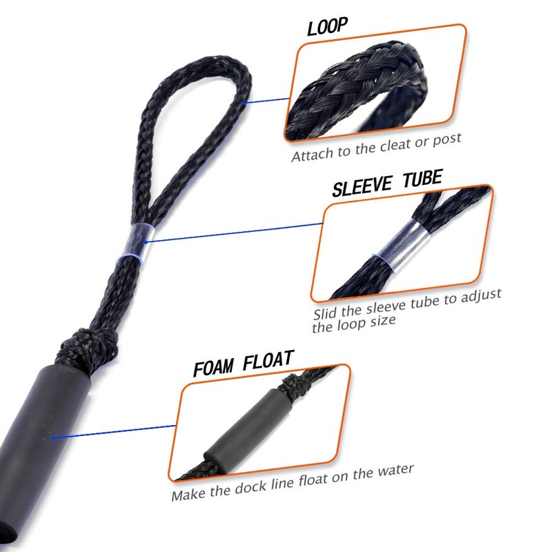 - Quick docking: Place the loops over the cleat of the boat and dock and adjust the slider to attach the loops. The dock ropes are perfect for quickly and safely mooring kayak, jet ski, pontoon, sea doo, canoe, motor boat, waverunner etc.