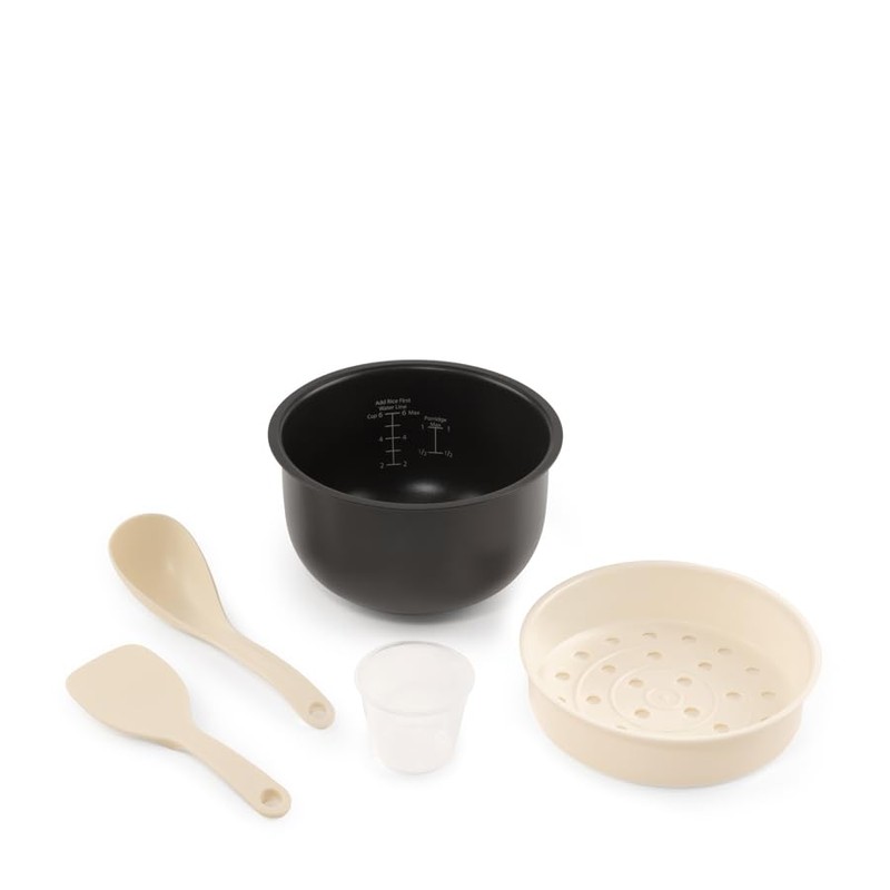 - Accessories included: rice measuring cup, soup ladle, steam tray, serving spatula, and premium nonstick inner pot