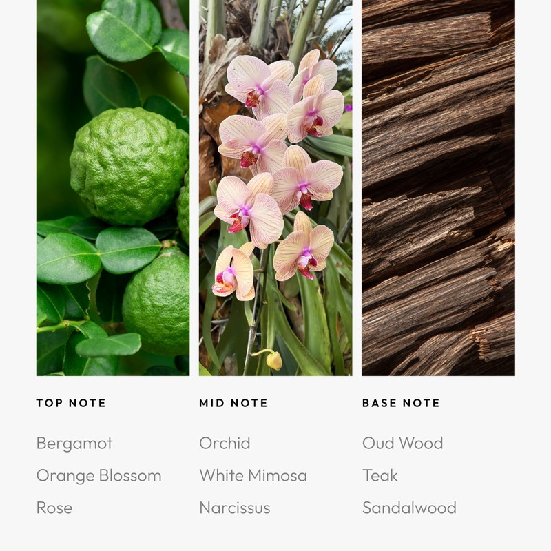 - Indulge in the alluring experience of our fragrance oil, blending invigorating bergamot, romantic rose, and honeyed orchid. Featuring top notes of Bergamot, Orange Blossom, and Rose, followed by a heart of Orchid, White Mimosa, and Narcissus, and anchored by the warmth of Oud Wood, Teak, and Sandalwood in the base.