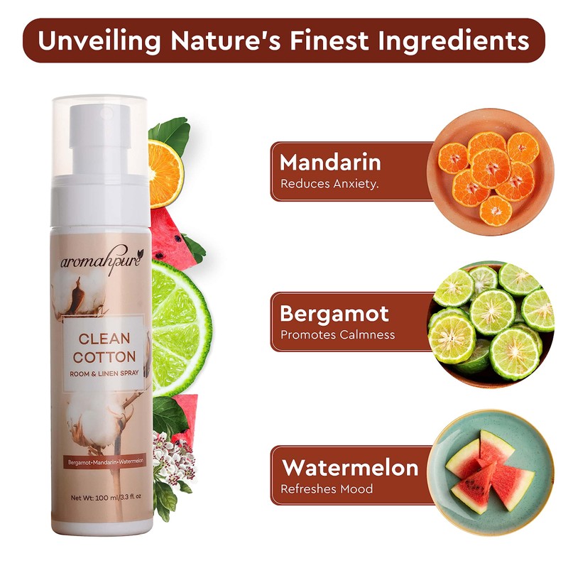 Aromahpure Cotton Bergamot, Mandarin, Watermelon Room & Linen Spray | 100 ml | 800+ Room Sprays | Essential Oil Odour Neutralizer