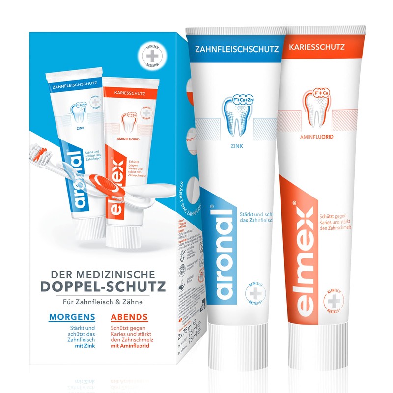 - Details & Box contents: aronal & ELMEX double protection, toothpaste set with strengthening zinc and remineralising amine fluoride, medical teeth cleaning for daily use, 2 x 75 ml