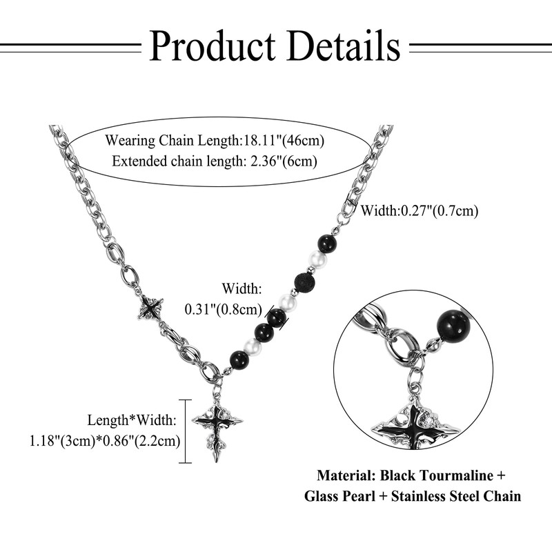 Embrace the powerful combination of natural black obsidian and tourmaline with this elegantly designed cross necklace. Each piece features carefully selected beads paired with glass pearls, creating a perfect balance between mystique and sophistication. The durable stainless steel chain measures 18.11 inches with a 2.36-inch extension chain, allowing for customizable wear.