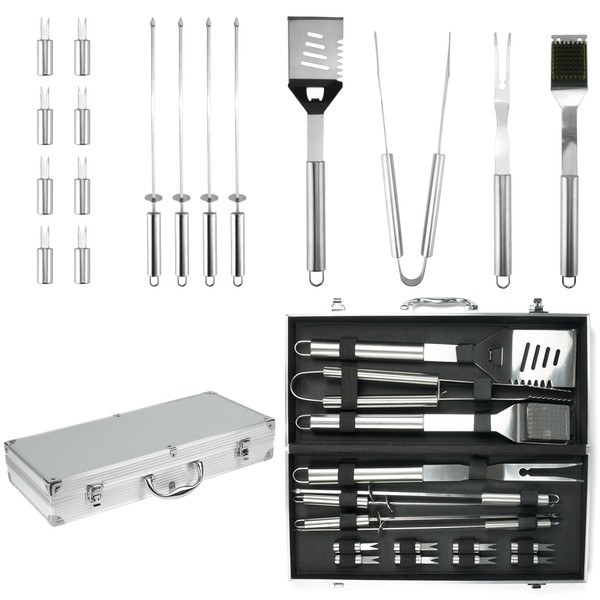 - Ultimate BBQ Accessories Kit: This 16-piece set includes a grill brush, fork, tongs, spatula, 8 corn holders, and 4 skewers, all stored in a durable aluminum case. Perfect for outdoor grill enthusiasts, this grill utensils set has everything you need for a successful BBQ.