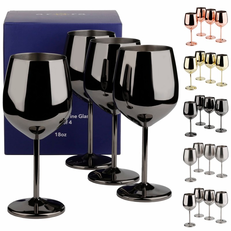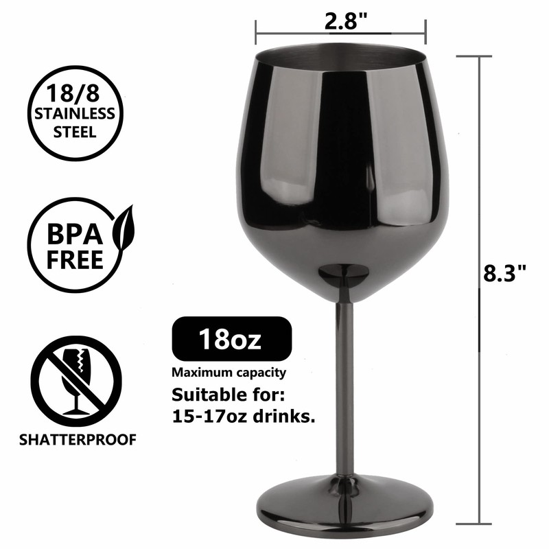 - Set of 4 stainless steel 18oz wine glasses. Ideal for red and white wines. Even great as a water goblet!