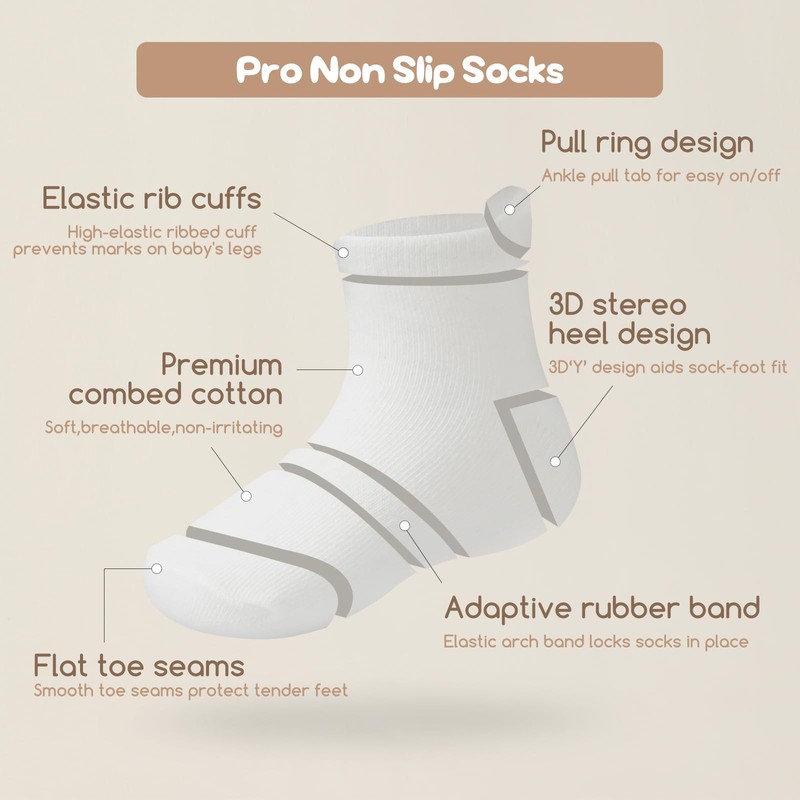 - 🏡NON-SLIP GRIP SOCKS:Soft skin-friendly, non-irritating,no pilling,no-color fading tech,breathability and softness for baby's feet,medium-thick baby non-slip socks for all seasons-with or without shoes.Cotton material is perfect for growing with your child.