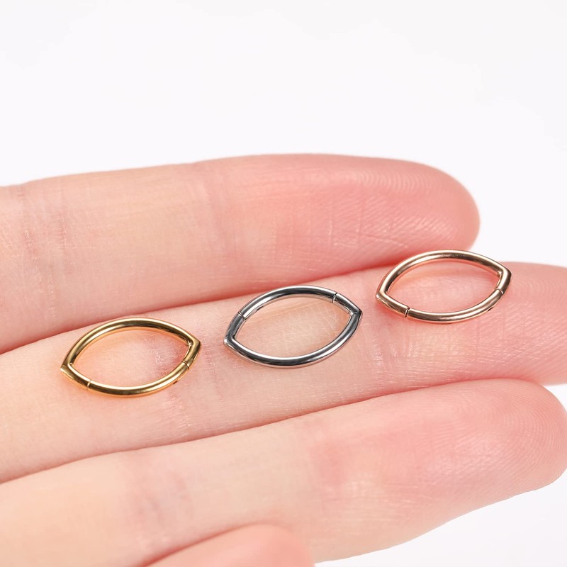 - Multifunctional: the oval clicker hoop with hinge is perfect for septum piercing, nose piercing, cartilage earring hoops, daith earrings, helix earrings, ear lobe piercing, etc.