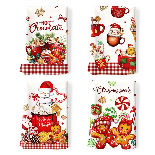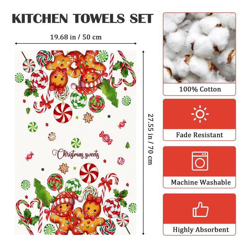 Arquiel 4 Pcs Christmas Kitchen Towel 100% Cotton Gingerbread Man Absorbent Dish Towels 70 x 48 cm Housewarming Candy Decorative Hand Towels for Dining Home