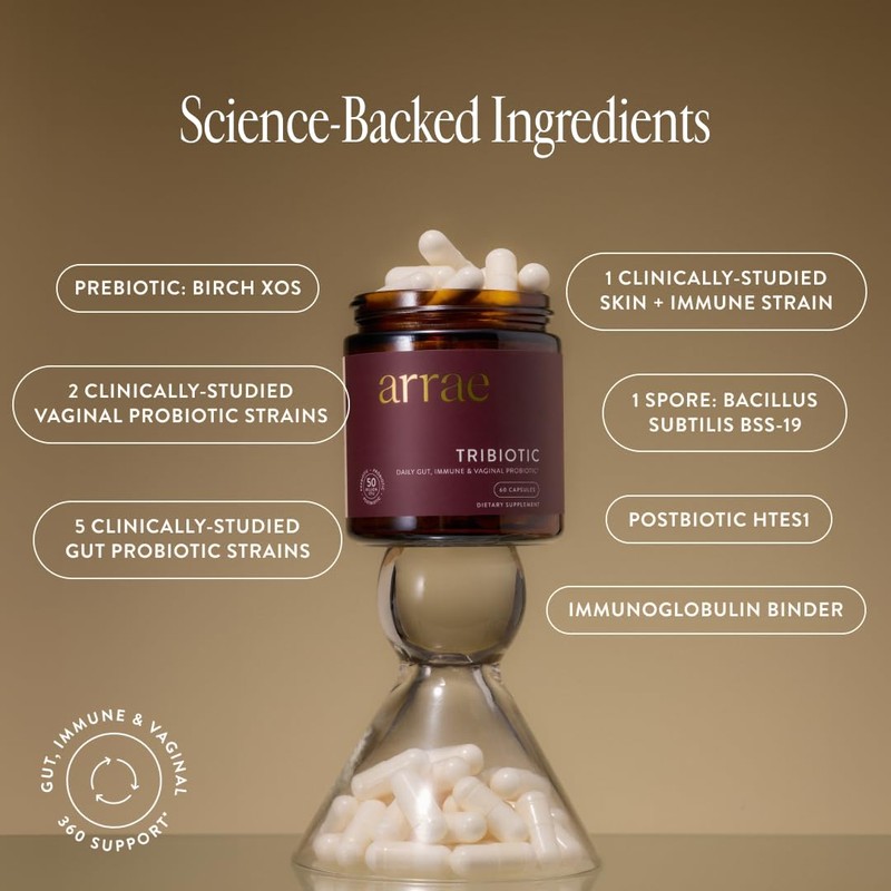 Arrae Tribiotic, Probiotics for Women, Support for Vaginal pH Balance, Gut, Immune, and Feminine Health, Prebiotics, Probiotics, Postbiotics, 60 Count