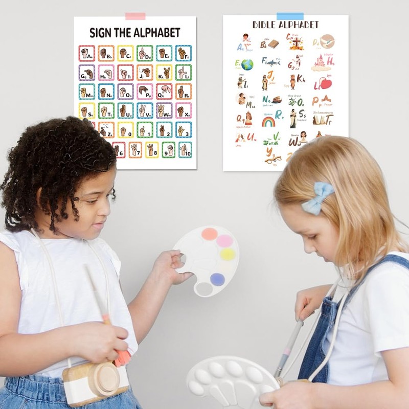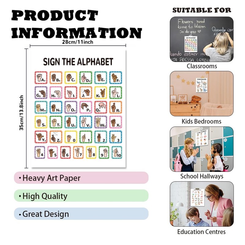 - Educational posters - Our posters show the 26 letters of the alphabet and the numbers 1-10 in the form of gestures and words that are clear, vivid and interesting. We believe this will help your son and daughter understand them better