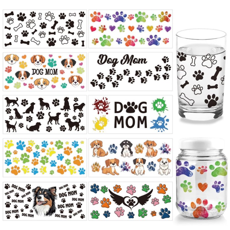 arricraft Pack of 10 UV DTF Cup Wrap Transfer Stickers 10 Styles Transfer Paper with Paw Prints with Dog Mama Words for Rubbing PVC Cup Wrap Waterproof Decals for Cups