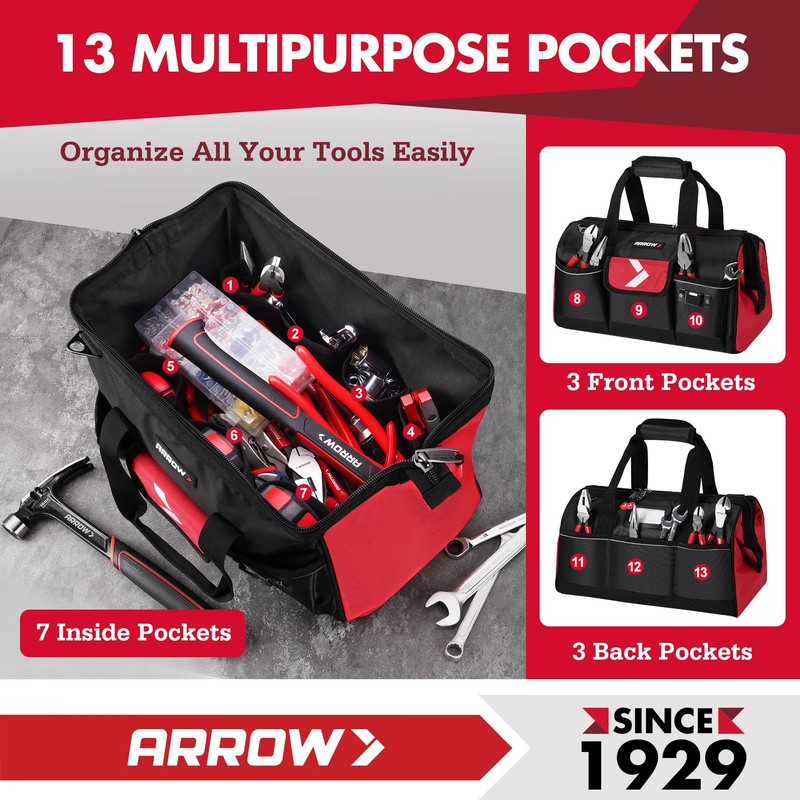 ARROW 16" Tool Bag Organizer with Anti-Slip Feet, Tool Bags for Men Heavy Duty, Wide Open Mouth, Large Capacity with 13 Pockets, Portable Toolbag for Electrician Mechanic Plumber HVAC
