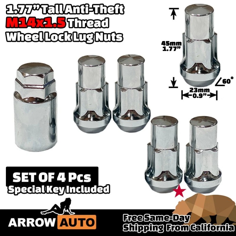 ARROW 4x 1.77" Chrome M14x1.5 Anti-Theft Wheel Lock Nut &Key Fit Infiniti Nissan Lexus