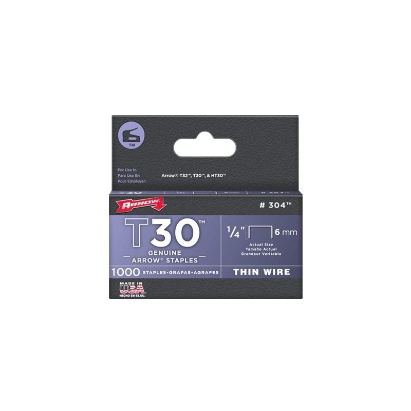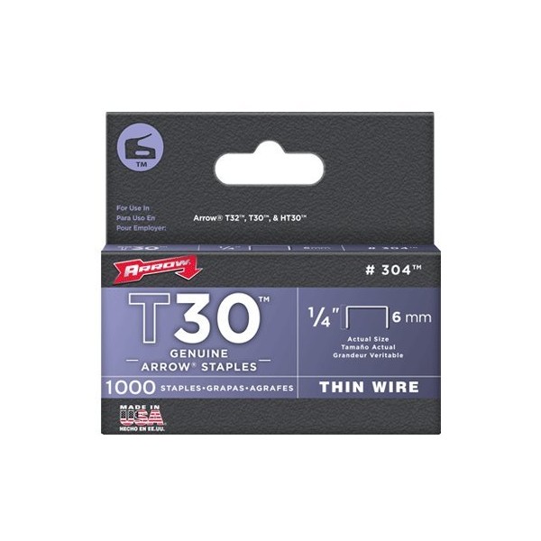 Arrow Fastener 304 T30 1/4" Flat Crown Thin Wire Staples 1000 per Package