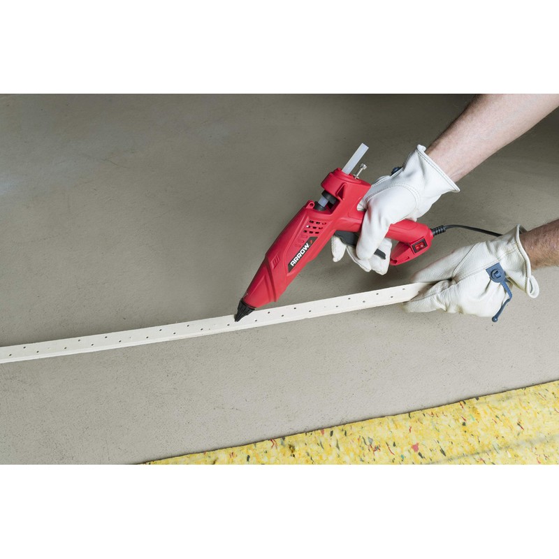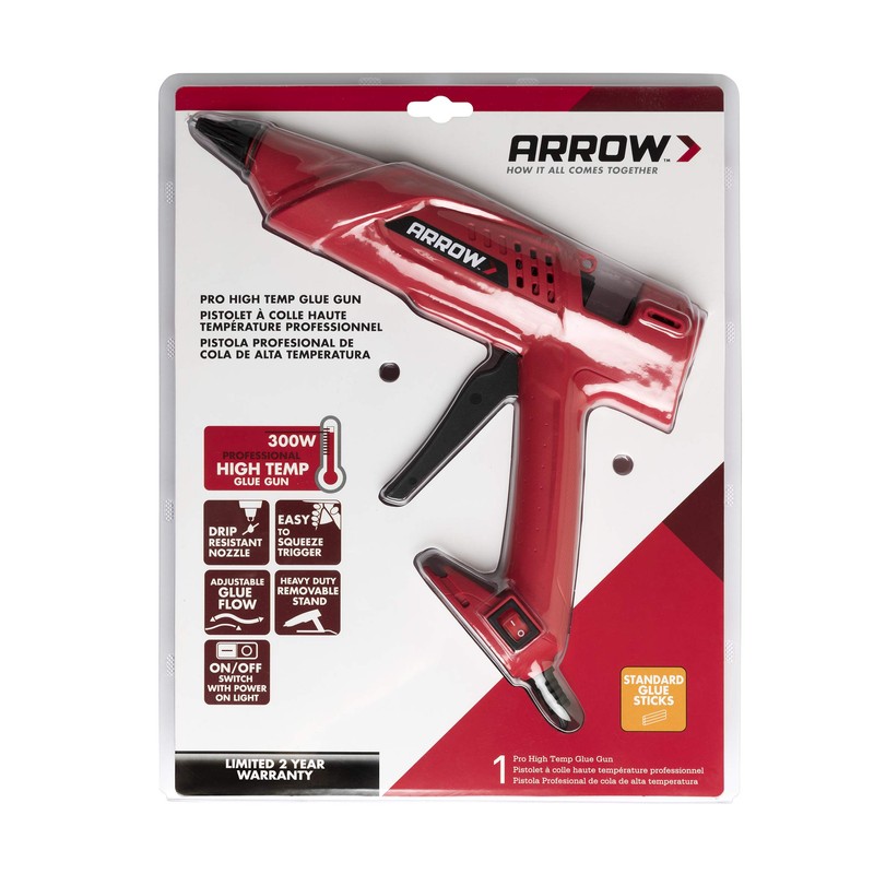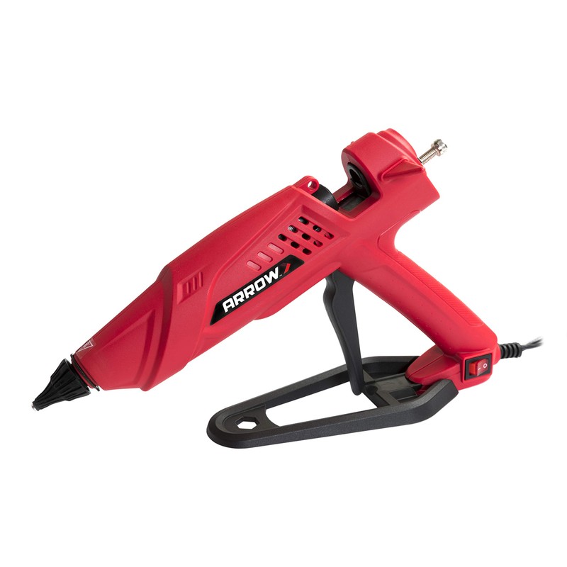 The Arrow high temp glue gun is a heavy duty, durable glue gun that offers the precision necessary for both Pro applications and DIY home repair. The 300W high temp glue gun heats up fast and offers the ultimate in glue control with the combination of its drip resistant nozzle and precision glue control adjustment knob making it easy to place small dots or smooth lines with accuracy. Ergonomically designed for convenience and control, the tool is lightweight with an easy to pull oversized trigger. The glue gun’s extended nose design helps with hard to reach corners or when a little extra reach is needed in a tight work area, making it perfect for intricate upholstery projects to large general home repair projects. The GT300™ comes with a sturdy base stand and wing stands to prevent the chance of hot melt glue back flow or mishaps when placing the tool down during glue application.