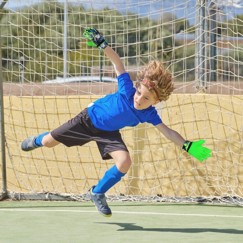 # Durable & Comfortable: These kids soccer gloves for kids are durable with study stitches. Premium latex on palm makes it comfortable and reliable in hot & cold climate. The goal keeper's Glove has a double sewing technology that make a strong connection between Goalie fingers. The double stitch help to prevent keeper gloves from tearing even hard training and make it last long. Being made from high quality composite materials of EVA and latex, soccer gloves goalkeeper youth protects the palm. The junior goalkeeper gloves has a double sewing technology that make a strong connection between Goalie fingers.