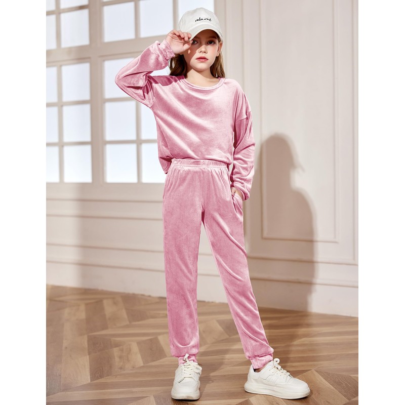 Arshiner Girls 2PC Outfits Long Sleeve Soft Velvet Tracksuits for Kids Plain Sweatshirts Workout Sets Active Wear Pink Size 11-12Y