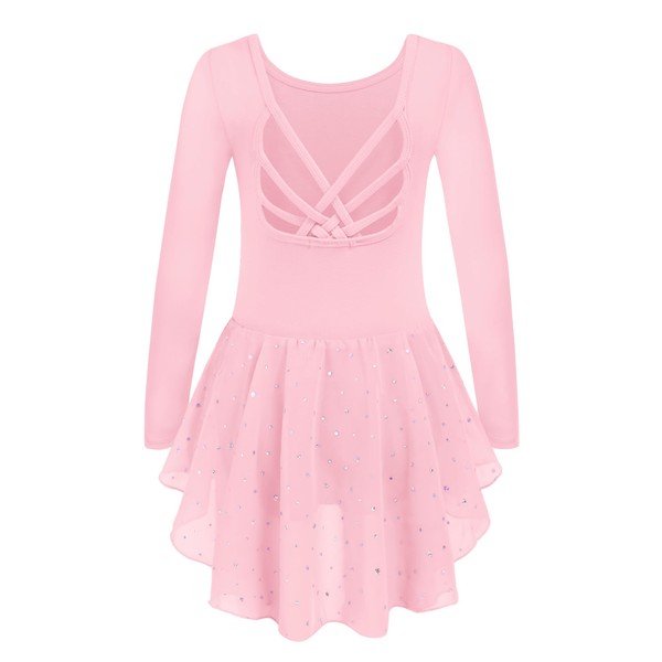 Arshiner Girls Ballet Leotard with Shiny Skirt Long Sleeve Criss-Cross Back Dance Dresses,Ballet Pink,6-7Y