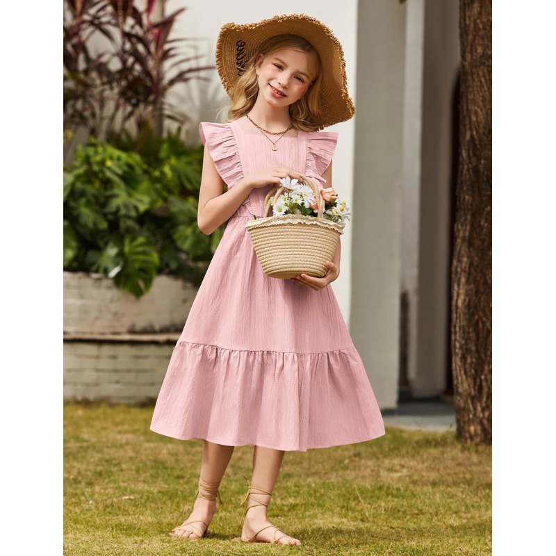Arshiner Girls Summer Dress Pink Easter Party Boho Tie Back Square Neck Swing Flowy Tiered Maxi Dresses for 10-11 Years