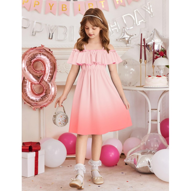 Arshiner Girls Summer Floral Ruffle Sundress Cold Shoulder Casual Holiday Dresses Pink Gradient 4-5 Year