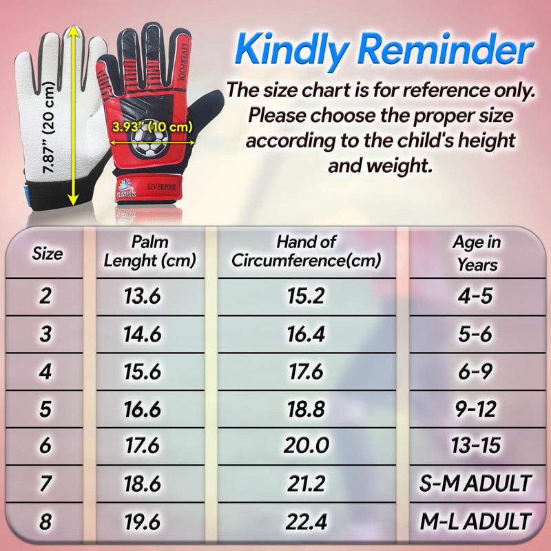- These perfect goalkeeper gloves are suitable for people from junior trainees to high school, all the way to adults soccer whether in training or match play. If there is any problem with the product, please don't hesitate to contact us.