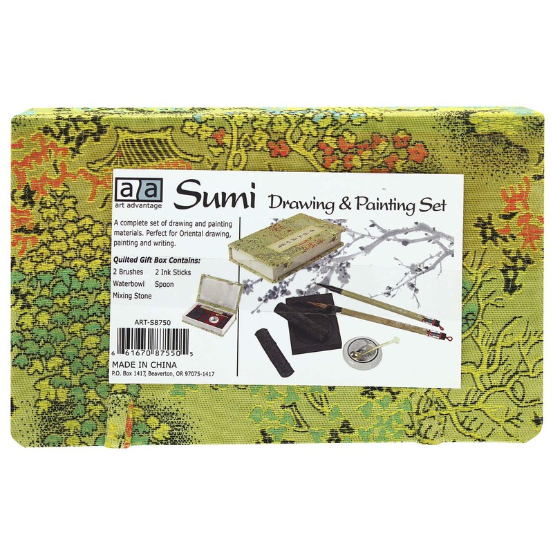 Art Advantage traditional sumi sets of drawing and painting materials. Perfect for Oriental writing, painting and drawing. Brocade covered gift boxes contain all the essential materials required. Eight piece set contains two ink sticks, a water bowl and spoon, ink mixing stone and two brushes.