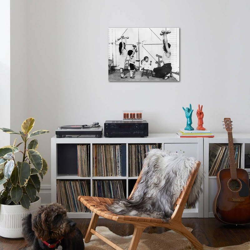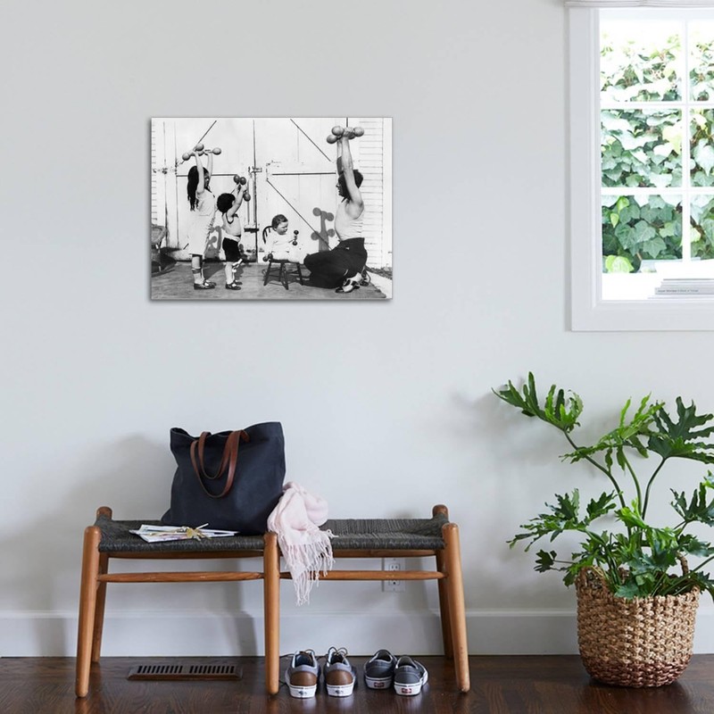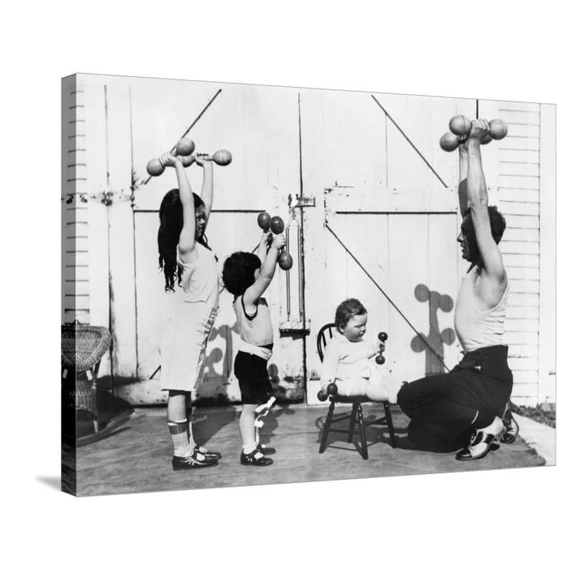 ART.COM Stretched Canvas Print Father and His Three Children Having a Workout with Dumbbells, 32" x 24"
