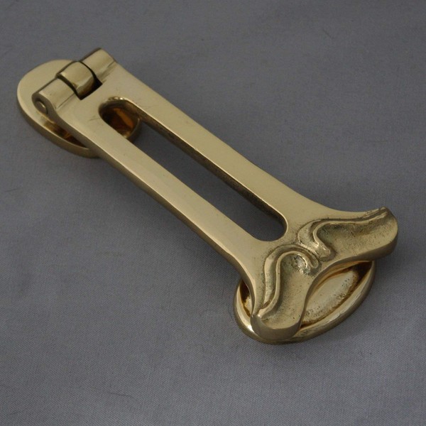 A good quality Art Nouveau style brass door knocker with separate brass strike plate. Heavy for its size at 500g. Un-lacquered so will tarnish but can be re-polished with a chrome cleaned. Dimensions & additional information: Finish: Brass Overall height: 165mm (6.5in) Max width: 66mm (2.5in) Projection: 25mm (1in) Strike plate size: 60mm x 42mm (2.25in x 1.5in) Distance between bolts: 130mm approx (5in) Length of Bolts: 55mm (2.25in) Weight: 500g Supplied with: Matching brass headed bolts VAT is in included.