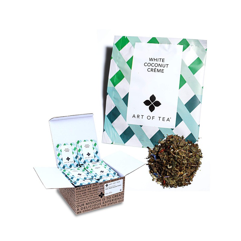 - DELICIOUS EXPERIENCE – This Art of Tea Bulk pack includes 50 pyramid tea sachets of your favorite White Coconut Crème Tea. This sweet, creamy dessert tea fusion is a hand-blended mixture of smooth creamy coconut, herbal botanicals, and a hint of nutty toasted almond and French vanilla bean for a smooth tropical cream flavored sip that will whisk you away to your very own island dreams.