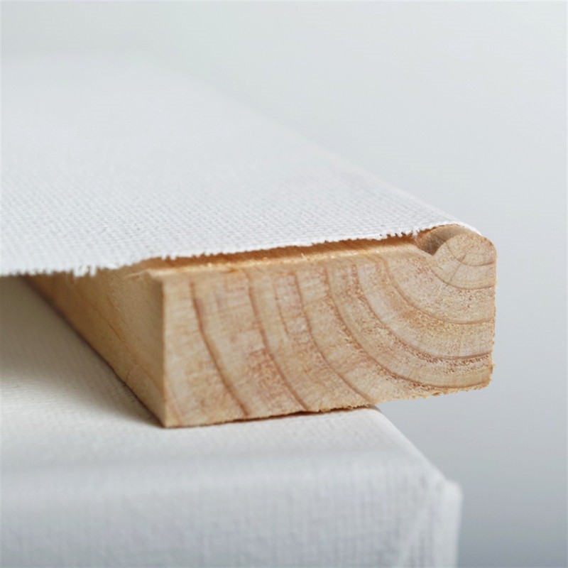 • The stretcher frame strips: the stretcher bars are made of largely knot-free spruce wood and therefore stable and low torsion. The profile of the stretcher frame has the typical outer bead that prevents the canvas from resting on the stretcher frame wood, and thus allows an even colour application. The profile of the stretcher frame has a height of 17 mm and a width of 26 mm, smaller formats have a profile of 15 x 25 mm (H x W).