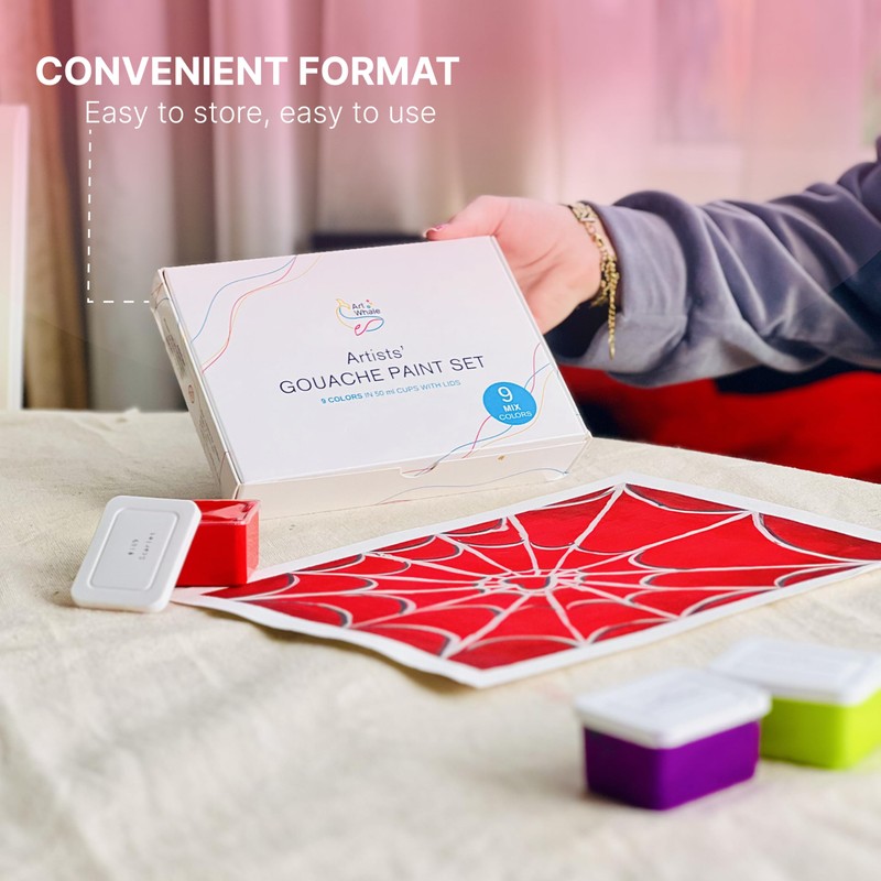 Art Whale Gouache Paint Set 9 Basic Colors (50ml/1.7oz) Cups With Lids|Intense Pigments, Refillable (9 pcs.)