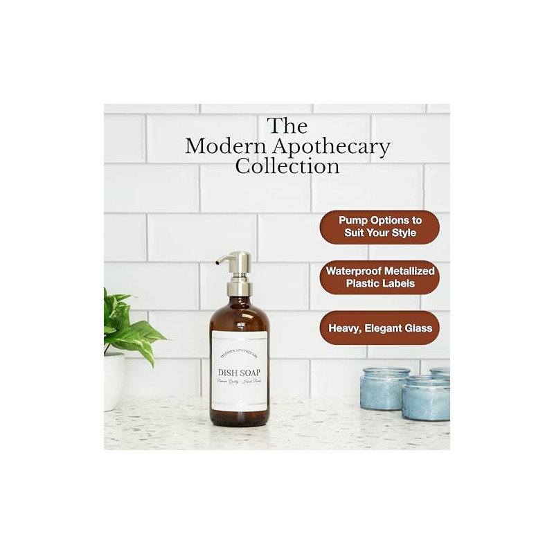 Artanis Home Amber Refillable Dish Soap Dispenser with Pump for Kitchen Sink - Glass Boston Round Dish Detergent Bottle - Waterproof Label - 16 oz