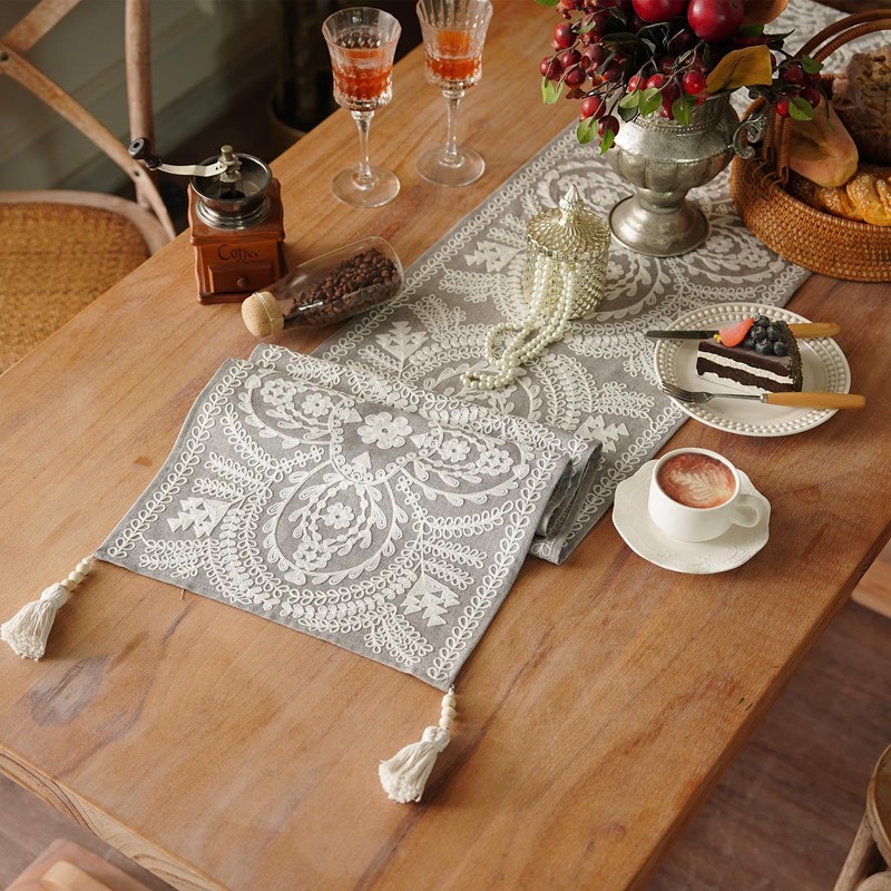 - Exquisite Embroidery Craftsmanship: Elevate your table setting with our table runner featuring chain embroidery by white thread. The intricate design adds an air of sophistication that complements any occasion