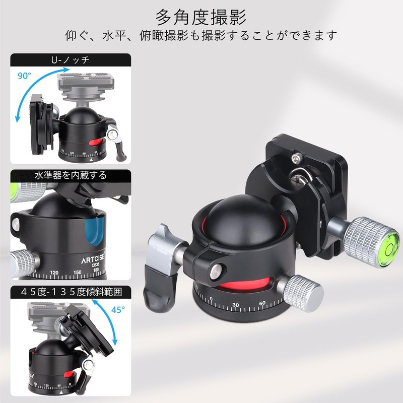 - 360° Panoramic and Multi-Angle Shooting: The lower part of the head has horizontal rotation knobs and angle rotation scales, so you can adjust the angle when shooting, and it is useful for subtle panoramic projects. The U-notch can be used for 90° vertical shooting, with a 0-135° tilt angle range, allowing you to shoot at different angles, making it ideal for indoor use, buildings, birds, wildlife photography, spaces, and starry skies