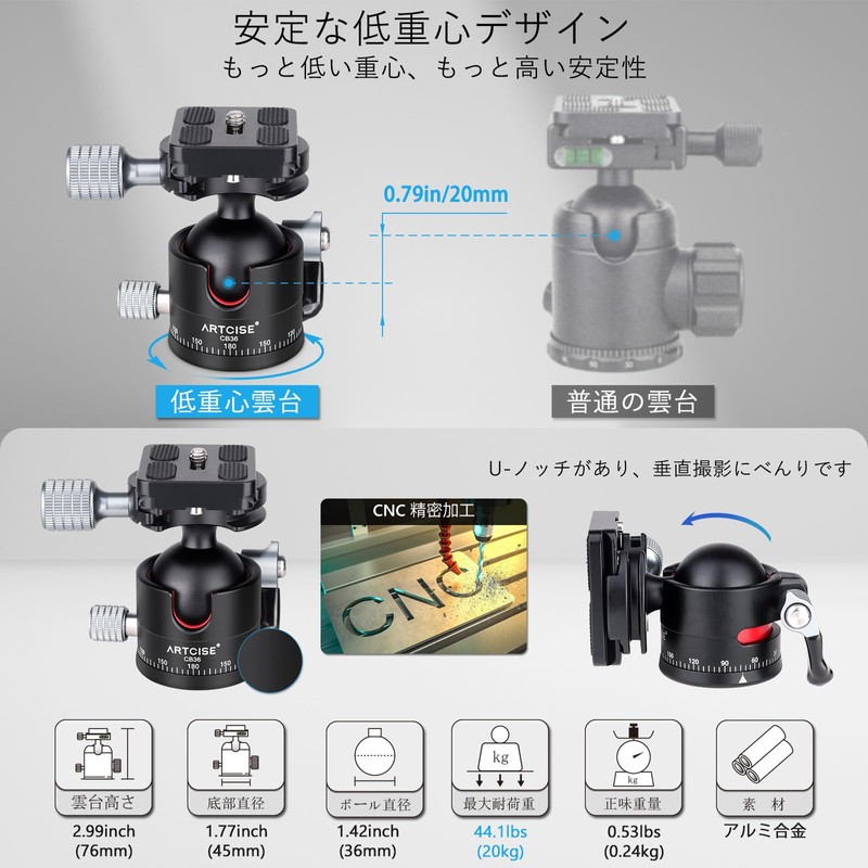 - Tripod ball head with a more stable low center of gravity design: The center of gravity is about 15% lower than other ball heads, and the diameter of the 1.4 inch (36 mm) ball provides good stability and high fixation. Head weight (0.24 kg), bottom diameter (45 mm), height (76 mm), maximum load (20 kg) and an extra Arca Swiss standard quick shoe