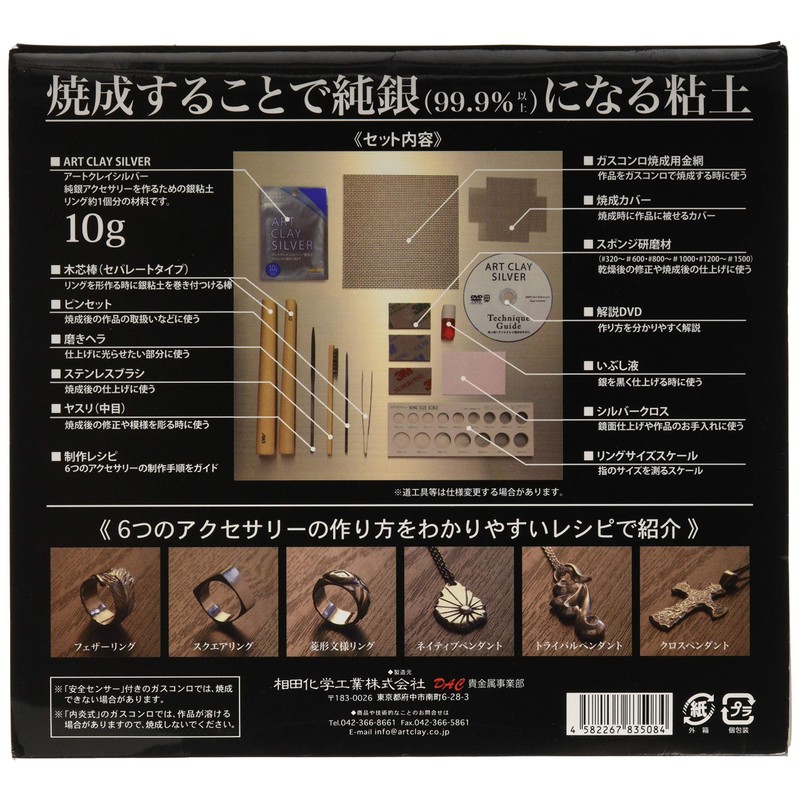 - Set Includes: Art Clay Silver 0.4 oz (10 g) x 1, Ring Size Scale, Silver Polishing Cloth Made by Town Talk, Oxidized Liquid, 3 types of Sponge Polishing Materials (Red, Blue, Green), Stainless Steel Brush, Medium File, Polishing Spatula, Tweezers, Wood Core Rod (Separate), Stainless Steel Net for Gas Burning (Auxiliary Net), Production Support DVD (Simple Packaging), Production Recipes