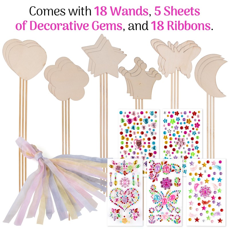 - MAKE YOUR OWN WANDS: Give little princesses the power to create their wands! This kit comes with 18 wooden wands, 18 ribbons, and 5 sticker sheets filled with gems in a variety of designs and colors.