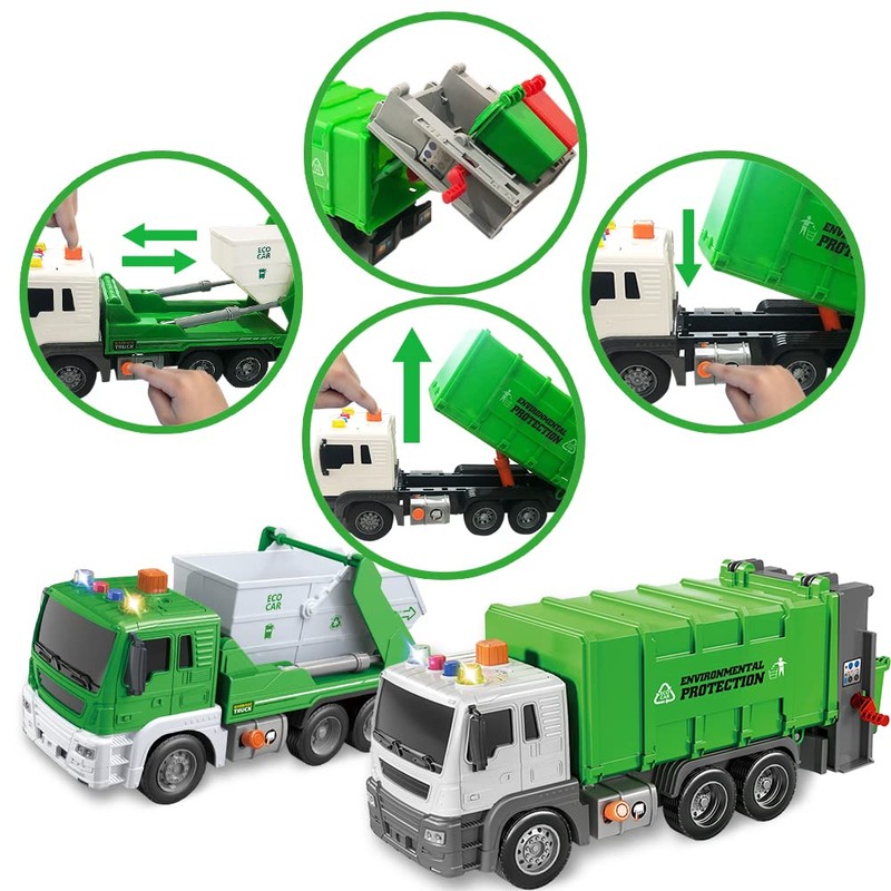 - LIFTING FUNCTION & EXHAUST: Trash truck toys for kids with movable parts are always a treat. The trucks come with an inflatable lifting function & exhaust, making them so much fun to use. They also include 3 replaceable LR44 batteries.