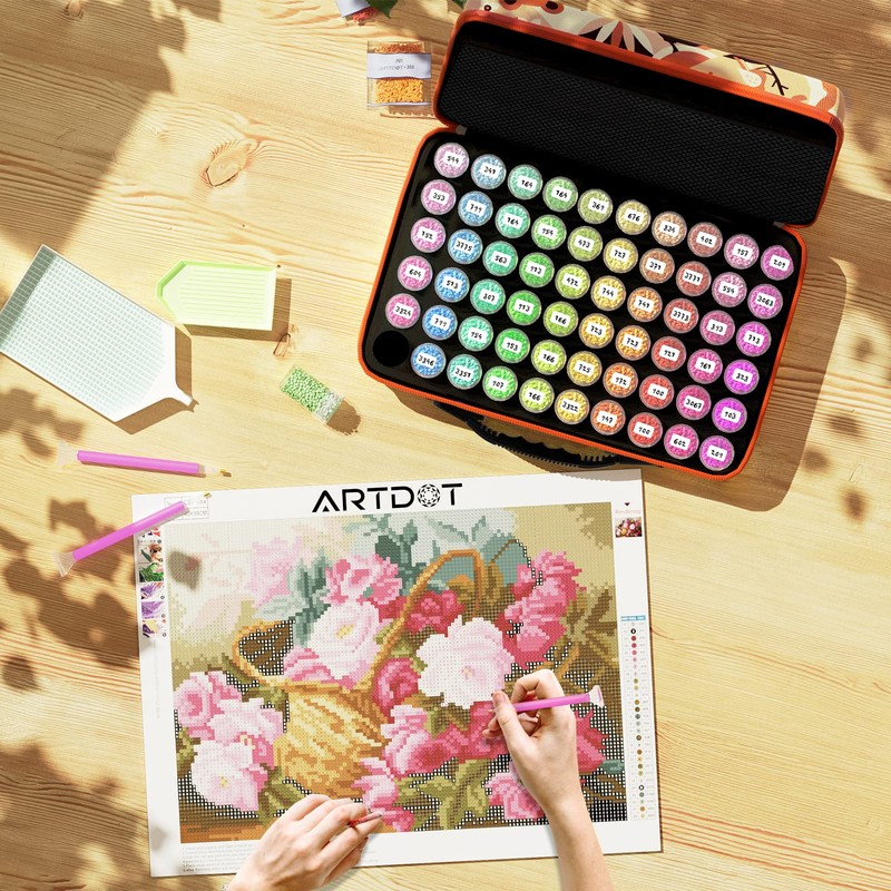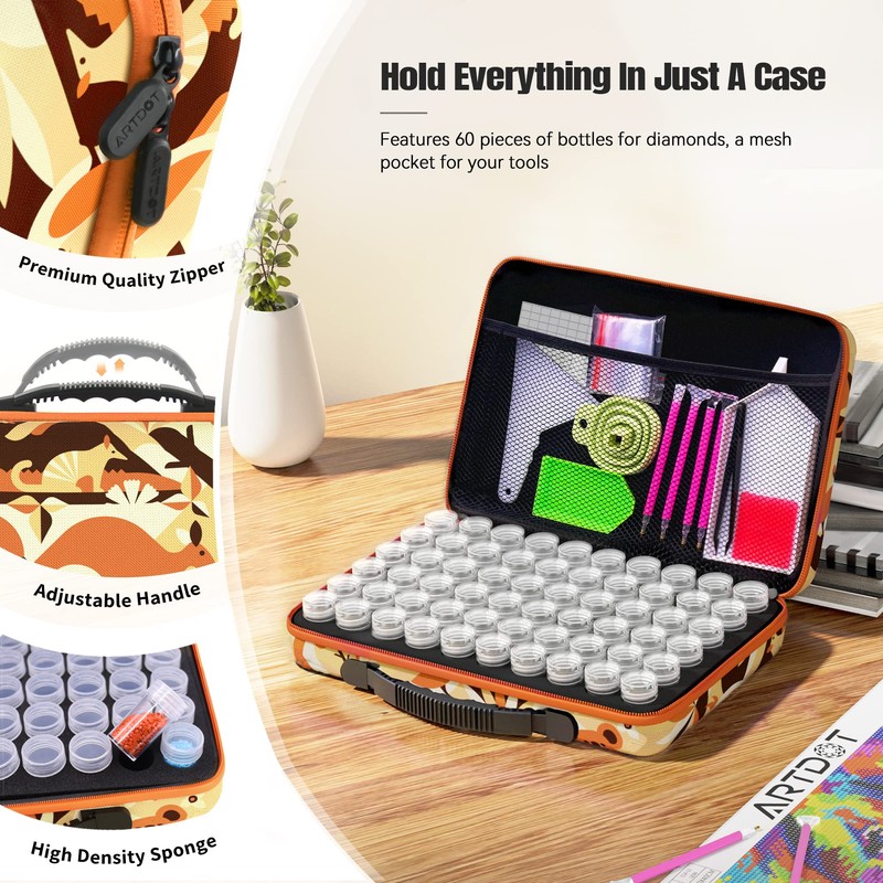 - HOLD EVERYTHING IN JUST A CASE - 60 containers nestled securely in a foam base for excellent anti-collision protection. The spacious net pocket hold all your diamond painting accessories, ensuring everything is tidy. Farewell to the cluttered workspace