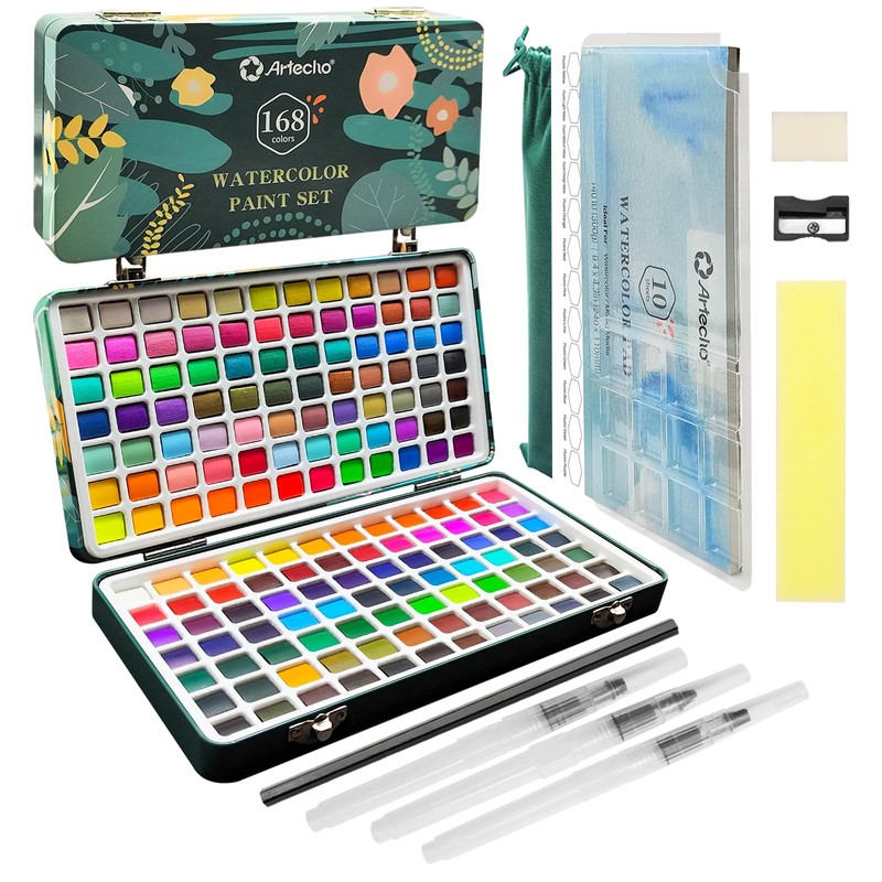 Artecho Watercolour Paint Set 168 Colours in Portable Box, with Brush and Watercolour Paper, Watercolour for Travel, Watercolours for Artists and Hobby Painters