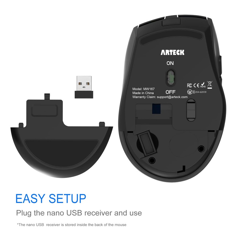 • What You Get: Arteck MW167 Wireless Mouse, one nano USB receiver (stored in the back of the mouse), USB-C charging cable, welcome guide, our 24-months warranty and friendly customer service.