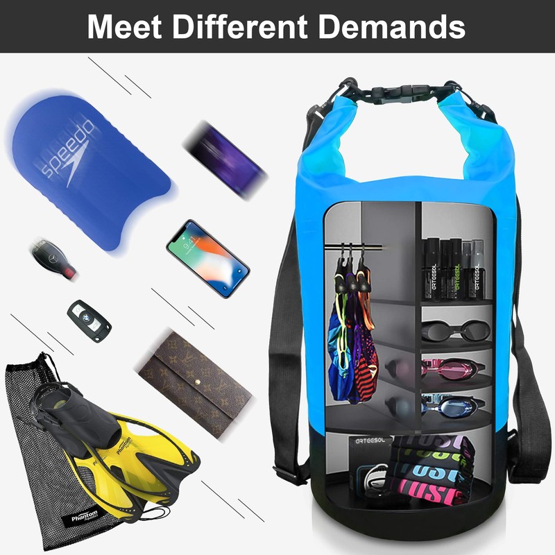 - Safety - The reflector strips give you high visibility at night. Boats, jet skis and surfers will not overlook you so there is no collision. The waterproof duffel bag comes with double shoulder straps. Thanks to the shoulder straps, the dry bag can be very comfortable for any body structure and can be converted from a shoulder bag into a backpack and handbag, and is very comfortable to carry.